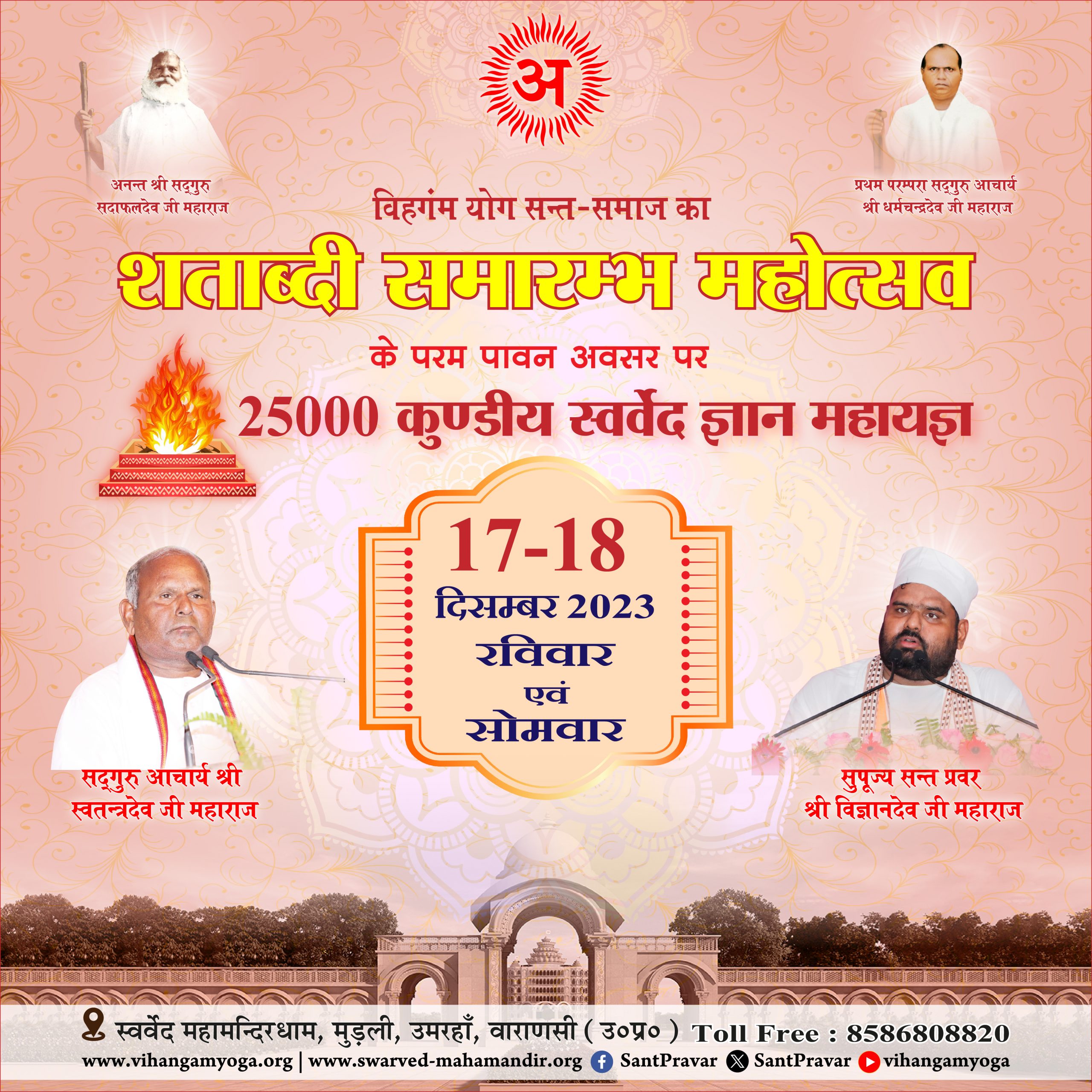 विहंगम योग संत-समाज के 100वें वार्षिकोत्सव को इस वर्ष ”शताब्दी समारम्भ महोत्सव” के रूप में दिनांक 17 एवं 18 दिसम्बर 2023 (मार्गशीर्ष शुक्ल पञ्चमी, षष्ठी) को स्वर्वेद महामन्दिर धाम, उमरहाँ, वाराणसी में बहुत ही भव्यता एवं दिव्यता के साथ मनाया जाएगा। इस पावन अवसर पर विशालतम 25,000 कुण्डीय स्वर्वेद ज्ञान महायज्ञ का बृहद् आयोजन किया जाएगा।